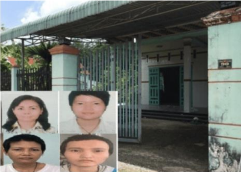Los cuatro acusados en el caso de asesinato y ocultación de cadáveres de Falun Gong en Vietnam y la casa donde ocurrió
