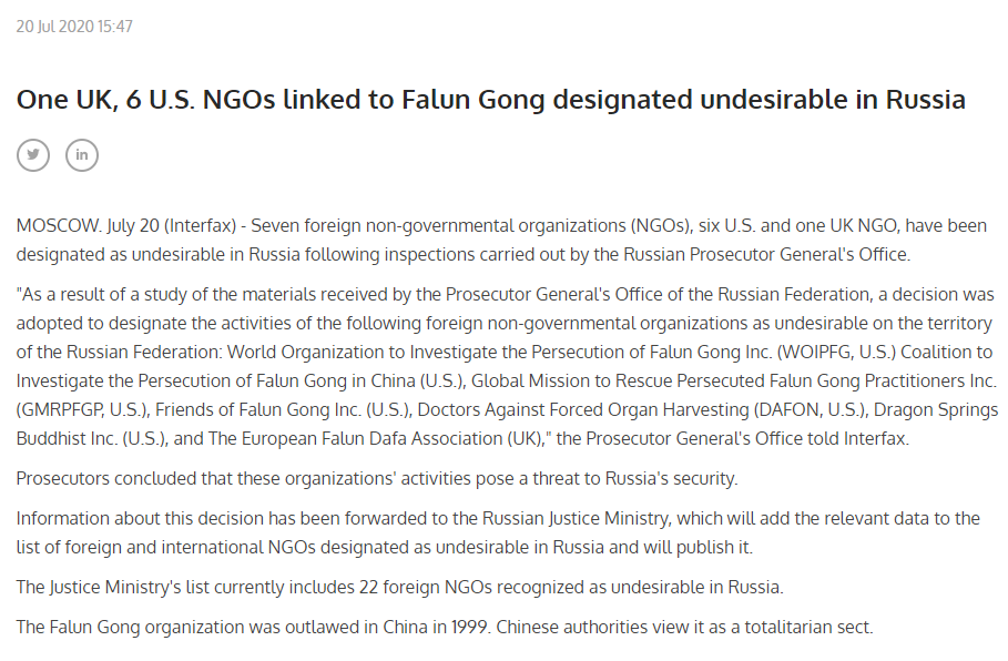 El 20 de julio de 2020, con el argumento de amenazar la seguridad nacional de rusia, la Fiscalía General de Rusia declaró a siete organizaciones de “Falun Gong” como indeseables en Rusia.